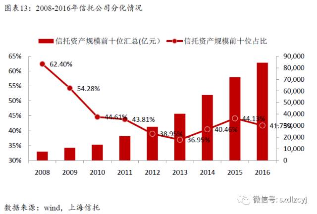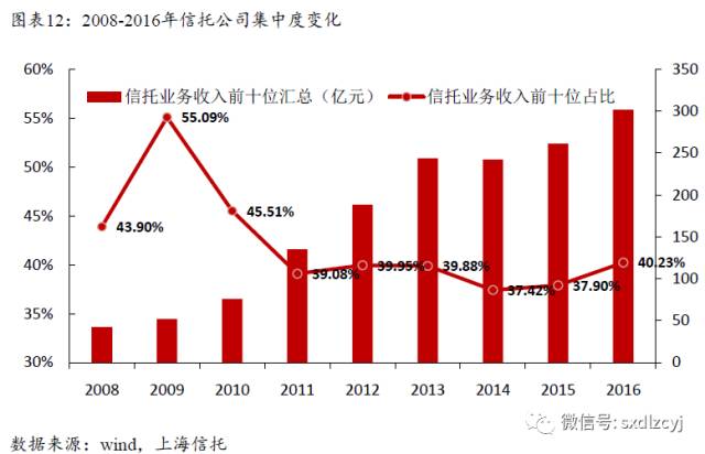 受利率市场化和资管行业竞争加剧的影响,信托公司回报率出现回落,净资产收益率和信托报酬率2016年分别为14.39%和0.41%,从2008至2016年的趋势来看,整体呈现下降趋势。回报率下降除外部环境外,与信托公司自身也有关系,一方面是信托公司让渡自身收益、忠实受益人最大利益的体现,另一方面是信托业处于转型升级阶段的真实反映。因此,提高主动管理能力(包括资金募集能力、资产获取能力、投资管理能力、风险管理能力、运营能力)仍是信托业可持续发展的关键。 从信托业务收入和信托资产规模两项指标看,近几年信托行业集中度小幅上升,并且维持高位。两项指标行业前十位占比均超过了行业总值的40%。2009-2012年的下滑主要源于信托公司数量从58家增加到了68家,信托行业公司数量稳定后,行业集中度维持了震荡上行的态势,信托业务收入前十位占比从39.95%上升到40.23%,信托资产规模前十位占比从38.95%上升到41.75%。信托公司之间的竞争将会使得更有效率的信托公司增长更快,市场集中度将会进一步提高。而在转型的过程中,信托公司之间的分化日趋明显。高速增长信托公司有所上升,部分信托公司的业绩持续快速增长,而行业业绩负增长的公司数量也在显著增加。 总体而言,我国信托业用实践证明了信托制度的活力和灵活性,其发展是顺承时代需求进行创新,依据经济、社会和法律的现代化进程,寻求每一阶段信托功能定位,未来信托行业仍将以服务实体经济为宗旨,坚持回归信托本源、提升主动管理能力、增强核心竞争力,在大资管业务竞争赢得先机。 注:王丹凤和杨辰参与了数据整理工作
