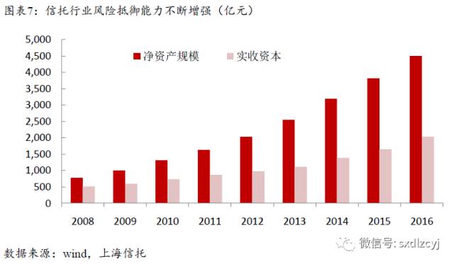 与信托资产管理规模相对应的是,信托行业注册资本和净资产规模也得到快速提升,2008年行业净资产仅为778亿,经过近八年的发展,2016年达到4502亿,复合增长率高达24.53%。特别是近几年,随着净资本管理办法加强实施、信托行业评级的施行和信托监管评级的调整,对资本规模和资本实力的关注和要求不断提高。因此,信托公司资本扩张的冲动也更加明显。仅2016年就有20家信托公司进行增资,实收资本共增加380.75亿元。资本实力大增情况下,信托行业的风险抵御能力大大提升。