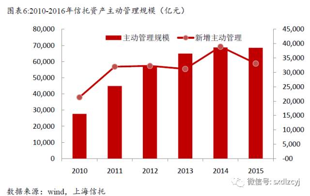 从主动管理存量信托资产规模来看,2011年行业合计的主动管理信托资产余额为2.76万亿,至2016年总体规模已经达到6.85万亿,年复合增长率19.90%。从新增的主动管理规模来看,2011年为2.13万亿,2016年增至3.31万亿,增长1.55倍。