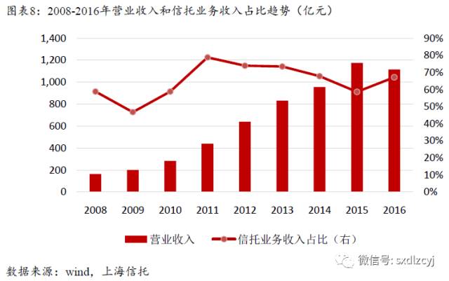 2016年信托行业营业收入达到1116.24亿元,其中信托业务成为行业收入增长的主要贡献来源。2016年度全行业实现信托业务收入 749.61亿元,占营业收入比例为67.16%,同比上升 8.55个百分点。信托收入占比拐点提升充分说明了信托行业更加注重主业。