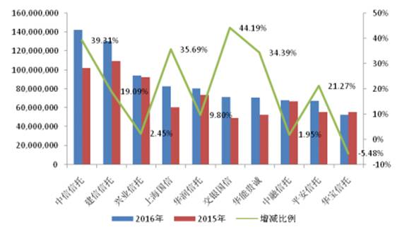根据2016年各信托公司年报披露的成绩,信托行业的整体经营规模稳步增长,68家信托公司管理的信托资产规模已经突破20万亿元人民币,但是管理成效差异化渐趋显著。受托资产规模排名前十的信托公司管理信托财产规模总额为8.62万亿元人民币,几乎占据全行业半壁江山,其中个别信托公司资管规模已经超过万亿,行业内差异化发展态势已经形成,信托公司普遍受益的牌照优势已经逐步弱化,信托品牌优势成为衡量信托公司转型成效的重要标准。