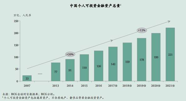 如上图所示,根据波士顿咨询最新报告,截至2016年底,中国个人可投资金融资产规模已达126万亿人民币,稳居世界第二位,为财富管理市场形成了百万级的蓄水池。